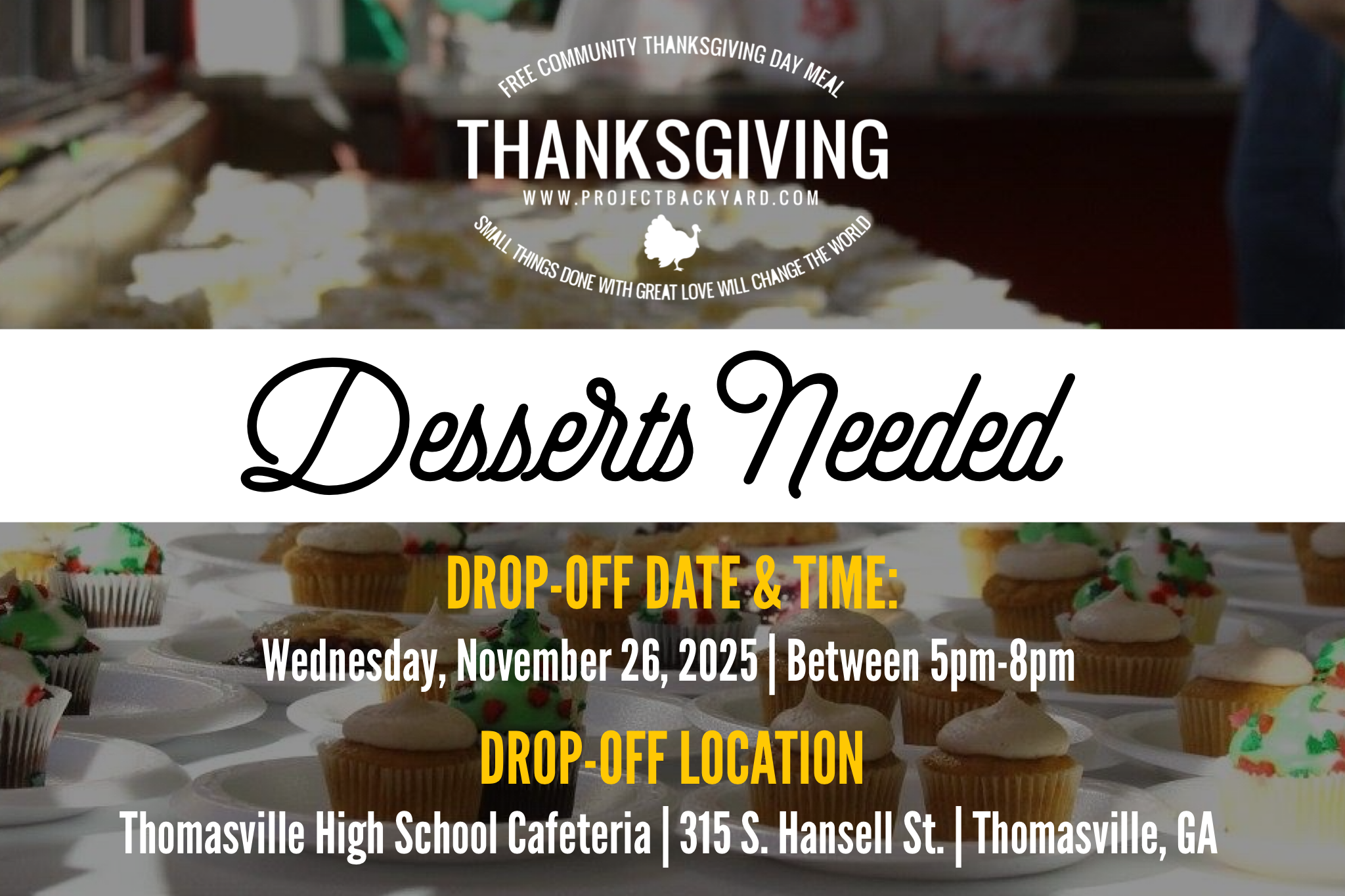 We invite you to join us in serving those in need on Thanksgiving Day (Thursday, November 27, 2025) at the Thomasville High School Cafeteria. To sign up to serve with us, click the link below: