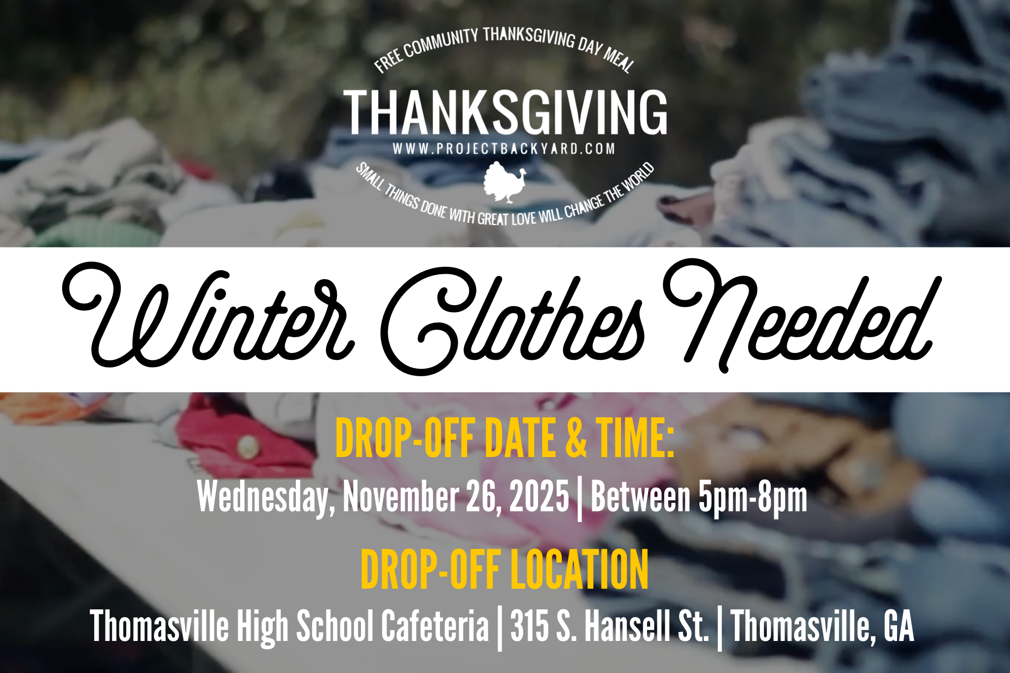 This year as part of our Thanksgiving Day Event, we will be offering a winter clothes giveaway to the community, so if you have any winter coats, sweaters, sweatshirts, blankets, pants, etc...we would love to take them off your hands to give them away to those who need them most. If you want to donate winter clothes, please bring them to the Thomasville High School Cafeteria on Wednesday, November 26th between 5pm-8pm.